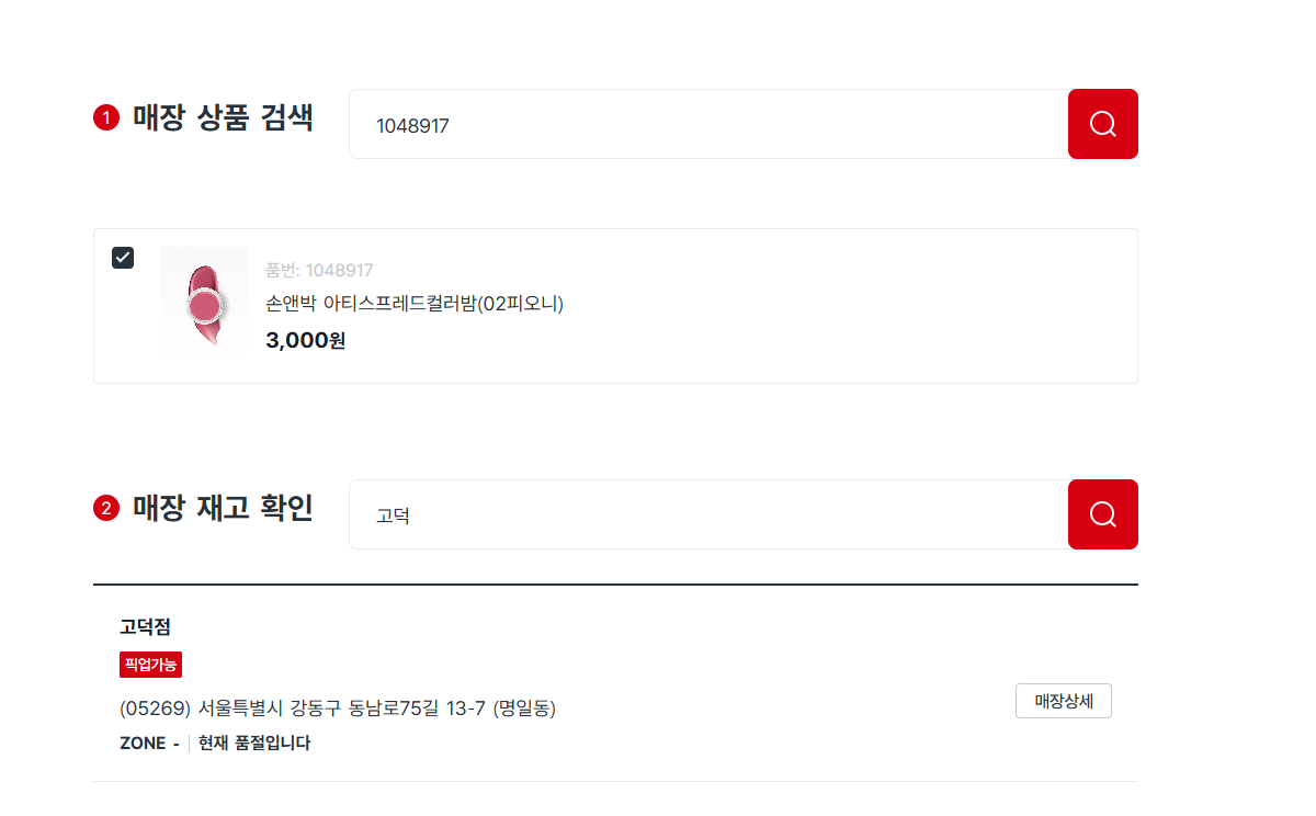 확인한 품명을 입력하고, 재고를 확인하고자 하는 지점을 확인하시면 끝!