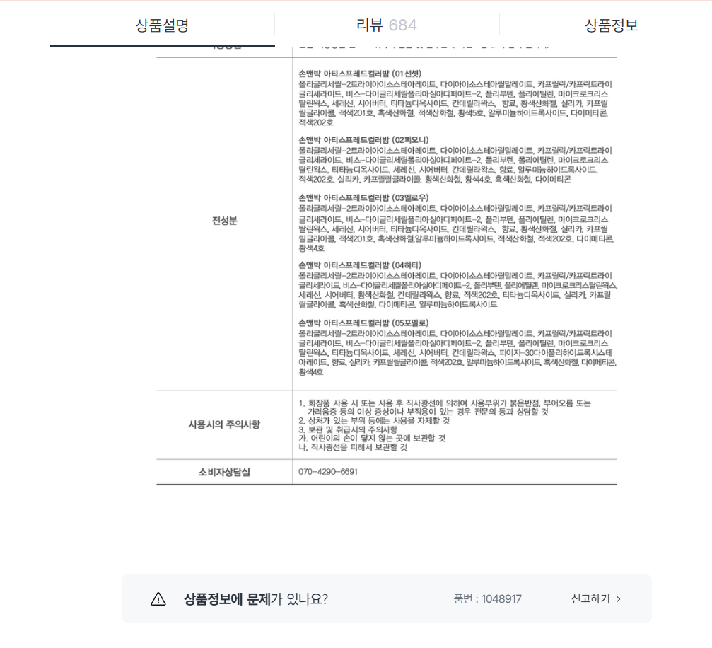 요 제품은 보시면 용량, 사용방법 다음에 품번이 나오는것을 확인할 수 있어요.