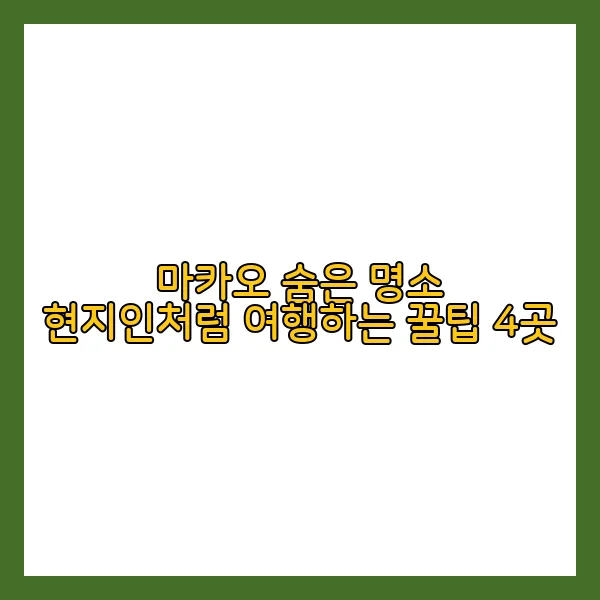 마카오 여행을 계획 중이신가요? 럭셔리 다이닝, 미쉐린 호텔등 화려한 느낌이 가득한 도시가 바로 마카오입니다. 하지만, 반짝이는 도시의 이면에는 마카오의 진짜 매력이 숨겨져 있습니다. 북적이는 관광지를 벗어나, 시간이 멈춘 듯한 마을, 현지인들의 삶이 녹아있는 골목, 마카오의 역사와 문화를 간직한 숨은 명소들을 탐험해 보세요! 이 포스팅에서는 현지인처럼 마카오를 즐길 수 있는 꿀팁 4곳을 소개합니다. 마카오의 숨겨진 보석들을 발견할 준비가 되셨나요?