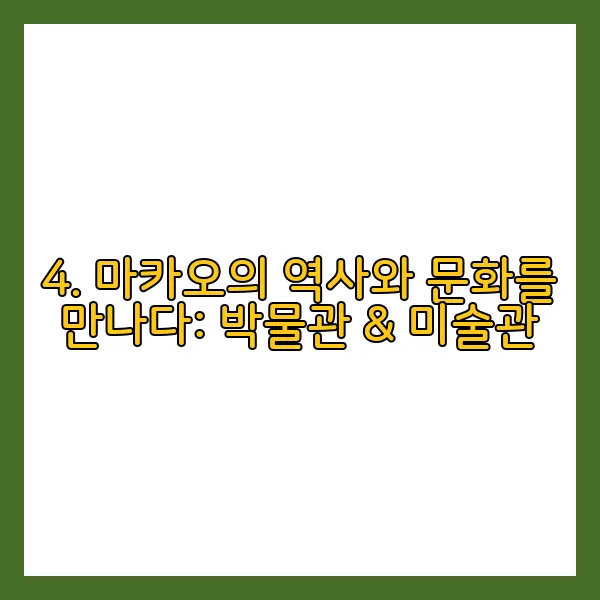 - 마카오 박물관: 마카오의 역사와 문화를 총망라하는 박물관! 고고학 유물부터 현대 미술 작품까지, 다양한 전시물을 통해 마카오의 과거와 현재를 한눈에 볼 수 있습니다.